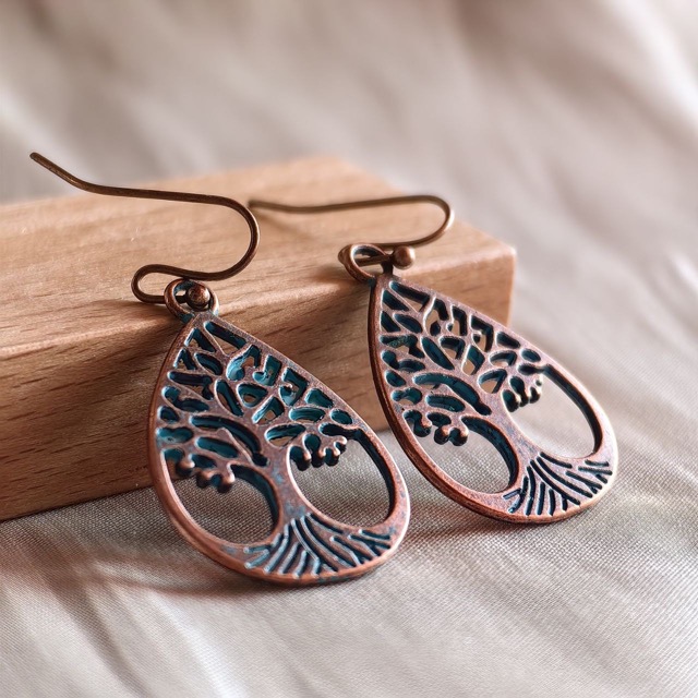 Ez a csepp alakú fülbevaló az Életfa szimbolikáját hordozza, amely az erőt, a védelmet és az élet körforgását jelképezi. Az antik réz és türkiz patinás árnyalatok különleges, vintage hatást adnak neki. Könnyed, mégis feltűnő kiegészítő, amely természetközeli és spirituális hangulatot kölcsönöz minden öltözéknek.