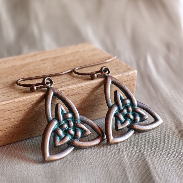 Ez a háromszög alakú, kelta ihletésű fülbevaló a harmóniát és az összekapcsolódást szimbolizálja. Antik réz és türkiz patinás árnyalatai különleges, vintage hangulatot kölcsönöznek. Könnyed, mégis látványos kiegészítő, amely tökéletesen illik a bohém vagy elegáns öltözékekhez is.