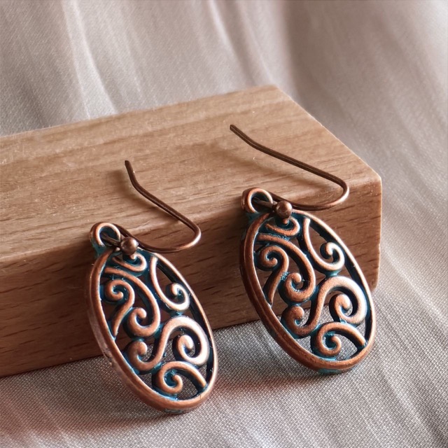 Ez a kis ovális fülbevaló elegáns, indás mintájával a természet és a harmónia szépségét idézi. Az antik réz és türkiz patinás árnyalatok különleges, vintage hatást kölcsönöznek neki. Diszkrét, mégis látványos kiegészítő.
