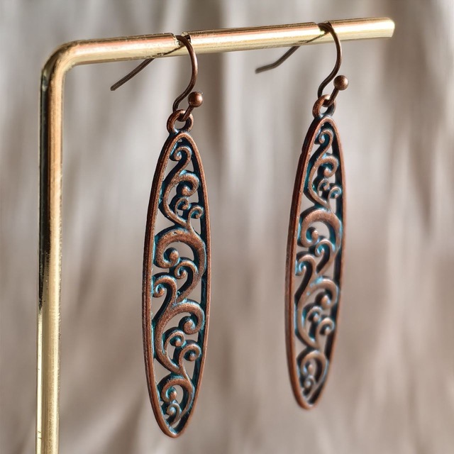 Ez a hosszúkás, ovális formájú fülbevaló elegáns, indás mintájával és antik réz-türkiz árnyalataival igazán különleges kiegészítő. Könnyed, mégis látványos darab, amely tökéletesen illik bohém vagy vintage stílusú öltözékhez.