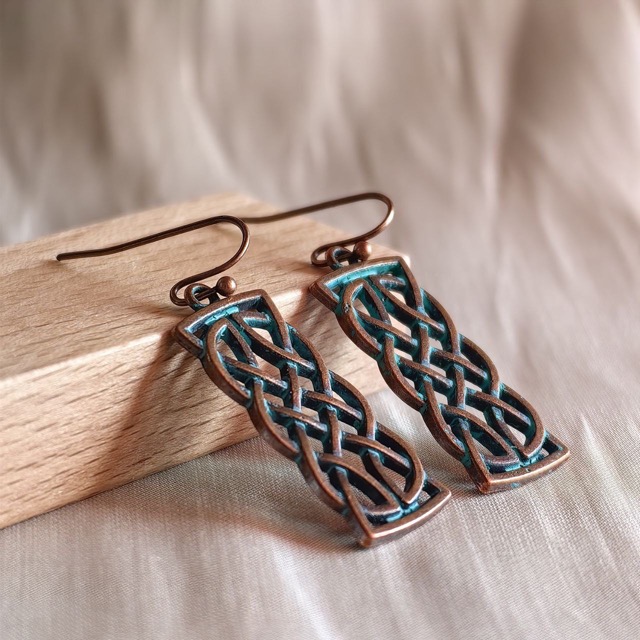 Ez a hosszúkás, kelta fonat mintájú fülbevaló különleges, antik hatású kiegészítő. A réz és türkiz patinás árnyalatok elegáns, mégis bohém megjelenést adnak, tökéletes választás a mindennapokra vagy különleges alkalmakra is.