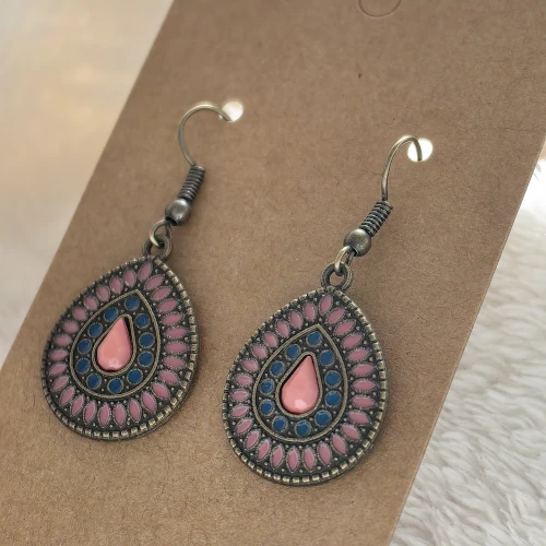 Légy elragadó ezzel a bájos, pink és kék színű csepp alakú fülbevalóval! Az antikolt bronz alap elegáns, filigrán mintázata finoman öleli körbe a pink és sötétkék árnyalatok játékát, amely egyszerre sugároz nőiességet és bohém stílust. A középen elhelyezkedő pink csepp dísz romantikus hangulatot teremt, míg a kék részletek modern kontrasztot adnak a designnak.