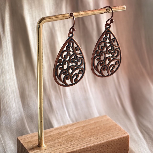 Ez a csepp alakú fülbevaló kecses, indás rácsmintájával elegáns és nőies kiegészítő. Az antik réz és türkiz patinás árnyalatok különleges, vintage hatást adnak neki. Könnyű, mégis látványos ékszer, amely feldobja a hétköznapi és az alkalmi öltözéket is.