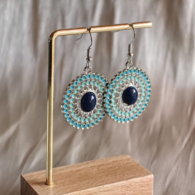 Ez a kör alakú, mandala mintázatú fülbevaló a türkiz és a mélykék elegáns harmóniáját hozza el. Különleges, mégis könnyed kiegészítő, amely feldobja a hétköznapi öltözéket, de akár nyári vagy fesztivál hangulathoz is tökéletes választás.